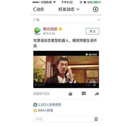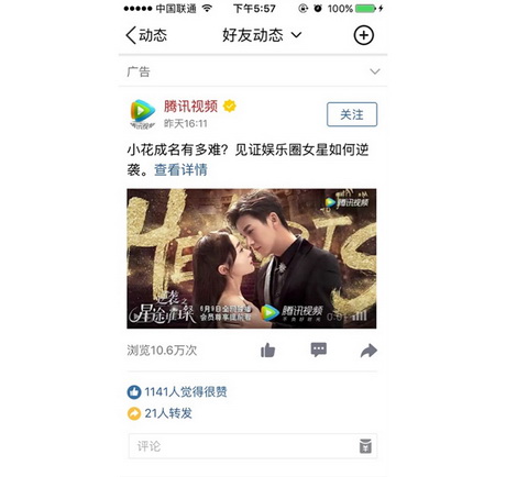 近期热播的亿万流量大剧《逆袭之星途璀璨》、一周即获千万播放量的二次元喜剧《我女朋友的男朋友》,姗姗来迟的影视大作《无问西东》,均以原生信息流广告形式,结合腾讯社交大数据的定向与人群挖掘能力,在上映前投放预告短片,试水这一全新触达模式。