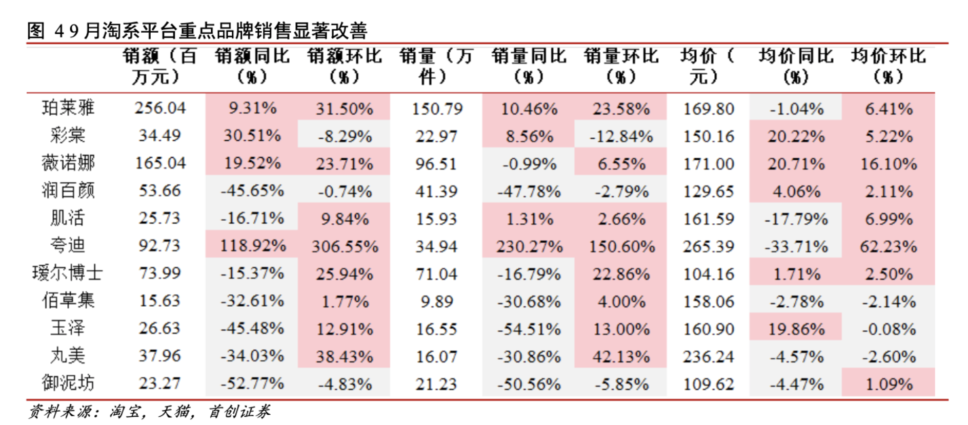 据9月销售数据显示,淘系平台化妆品类(美容护肤+彩妆)合计GMV为195.56亿元,环比增长7%,其中,国货头部品牌珀莱雅(603605)、薇诺娜及夸迪9月销额分别同比增长9.31%、19.52%、118.52%,环比增长31.50%、23.71%、306.55%。
