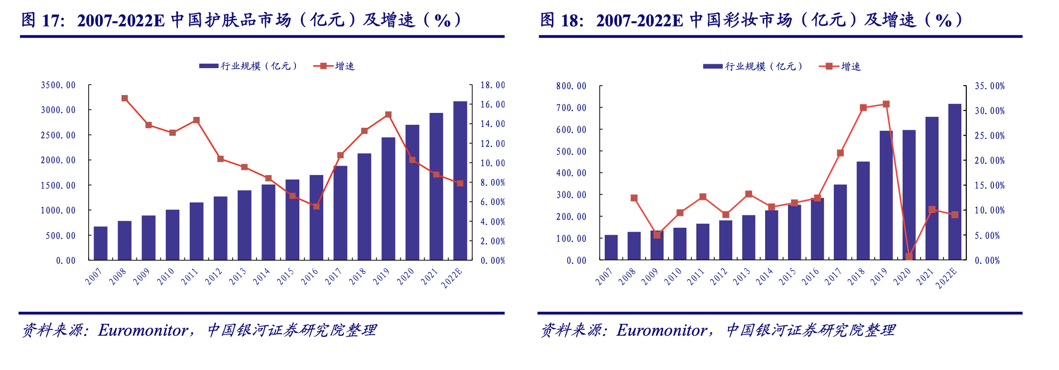 国盛证券研报指出,因拥有高复购率和高毛利的特点,美妆品类线上渗透率较高,且相比于其他品类,更适宜发展电商服务。公开资料称,2015-2020年美妆品类电商渠道渗透率从28.4%提升至45.5%,随抖音、小红书、拼多多等新兴电商平台兴起,渗透率有望进一步提升。据欧睿咨询预计,2022年美容个护产品市场规模将增长至6164.33亿元。