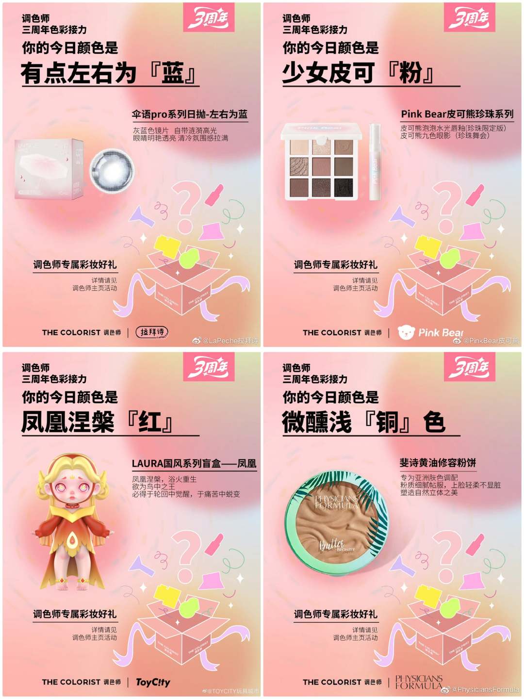 据运营团队介绍,除了寻找调色师女孩让消费者为自己代言外,调色师还联手25个新锐彩妆品牌以微博互动的方式接力庆生,目前,该活动总热度已达200万+。与此同时,调色师各大社交平台围绕三周年庆发起的主话题#调色师女孩#、#今天什么色#、#调色师3周年#,全网总阅读量达8000万+、讨论度突破百万。