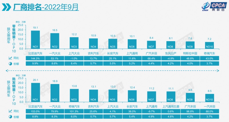 品牌方面,比亚迪(002594)狭义乘用车9月零售销量19.1万辆位居第一,一汽大众销量16.5万辆位居第二。值得注意的是,8月份比亚迪就以超过1.15万辆的成绩力压一汽大众夺得销量冠军,9月这一差距再次拉大到2.6万辆。