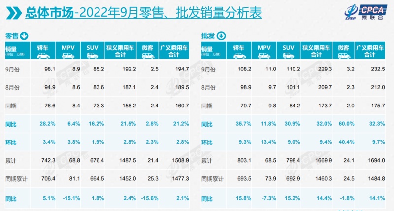 10月11日,乘联会发布《2022年9月全国乘用车市场分析》,数据显示,2022年9月乘用车市场零售达到192.2万辆,同比增长21.5%,增长较快;但9月零售环比增长2.8%,环比增速处于近20年同期历史低位。1-9月累计零售1487.5万辆,同比增长2.4%,同比净增35.5万辆,其中6-9月同比净增143万辆,增量贡献巨大。