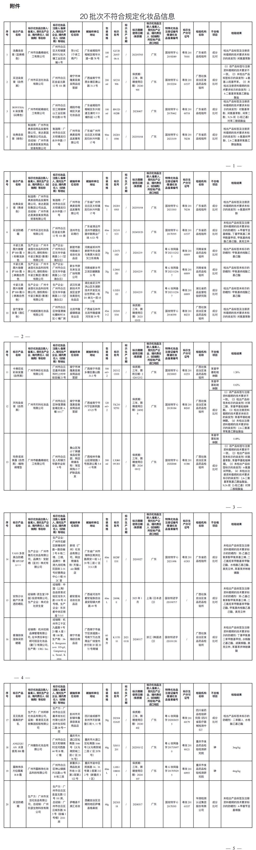 根据《化妆品监督管理条例》《化妆品生产经营监督管理办法》,国家药监局要求广东、上海、浙江省(市)药品监督管理部门对上述20批次不符合规定化妆品涉及的注册人、备案人、受托生产企业、境内责任人依法立案调查,责令相关企业立即依法采取风险控制措施并开展自查整改;各省(区、市)药品监督管理部门责令相关化妆品经营者立即停止经营上述化妆品,依法调查其进货查验记录等情况,对违法产品进行追根溯源;发现违法行为的,依法严肃查处;涉嫌犯罪的,依法移送公安机关。