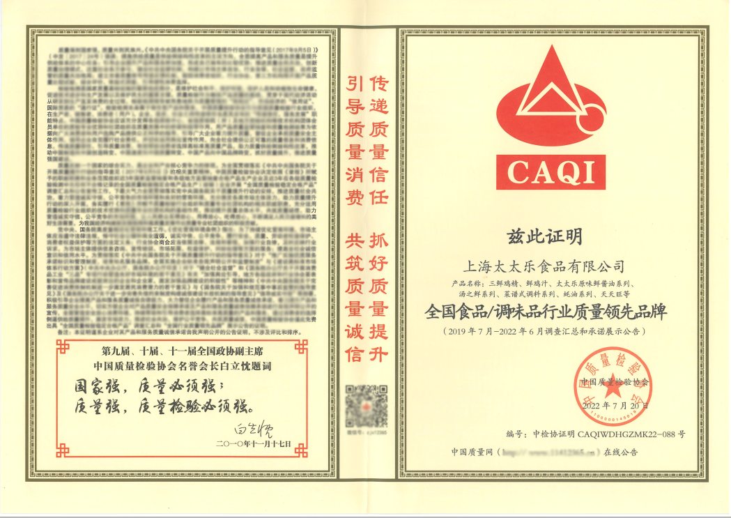 工贵其久,业贵其专,好产品是品牌立足的关键。近日,太太乐还荣获了中国质量检验协会颁发的“全国食品/调味品行业质量领先企业”、“全国食品/调味品行业质量领先品牌”、“全国质量检验稳定合格产品”三项荣誉称号,这些都离不开太太乐对于产品品质的严苛要求和标准。