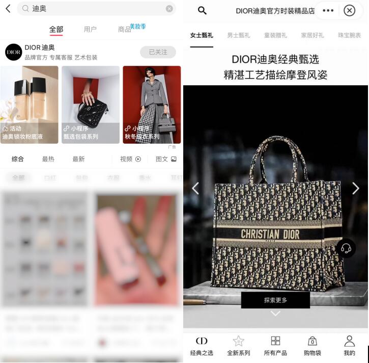 近期,高级时装品牌迪奥在小红书上线站内小程序,用户可以通过迪奥官方时装精品店小程序直接搜索并自主选购。