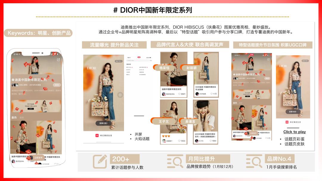 在「迪奥中国新年限定系列」的营销中,迪奥时装通过企业号联合品牌明星矩阵种草,之后借助「开屏、火焰话题、特型话题」等营销工具,提升节日氛围、吸引用户参与分享实现口碑积累,*最后达成品牌搜索趋势同步提升11%、1月手袋搜索排名第四的成绩。