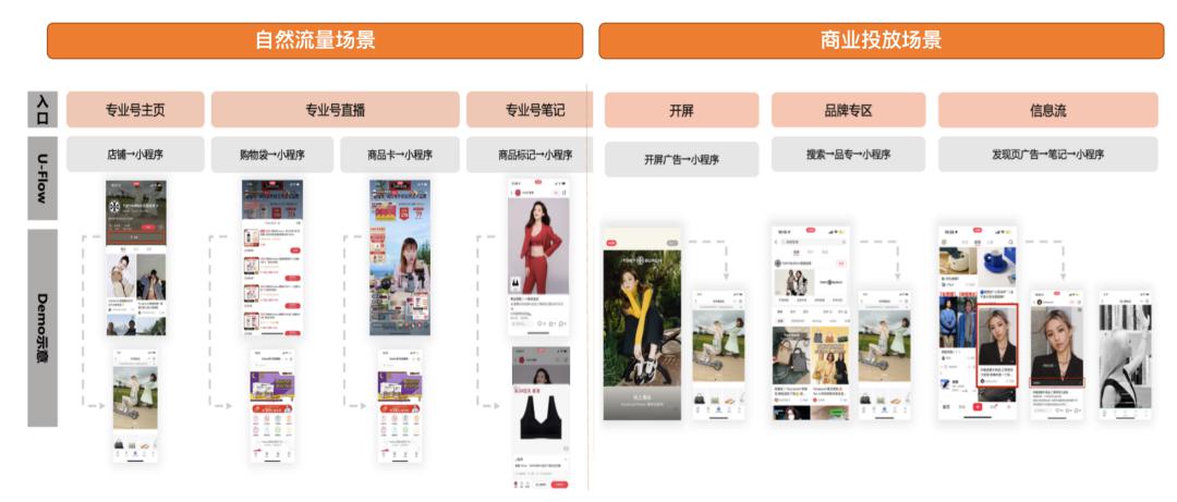 将小红书小程序嵌入到专业号主页、直播、笔记等自然流量场景,开屏、品牌专区、信息流等商业投放场景,可帮助品牌将曝光流量通过小程序累积到品牌私域,精准触达兴趣用户。小程序还能进一步帮助专业号功能迭代,维护品牌粘性最高的精准客群。