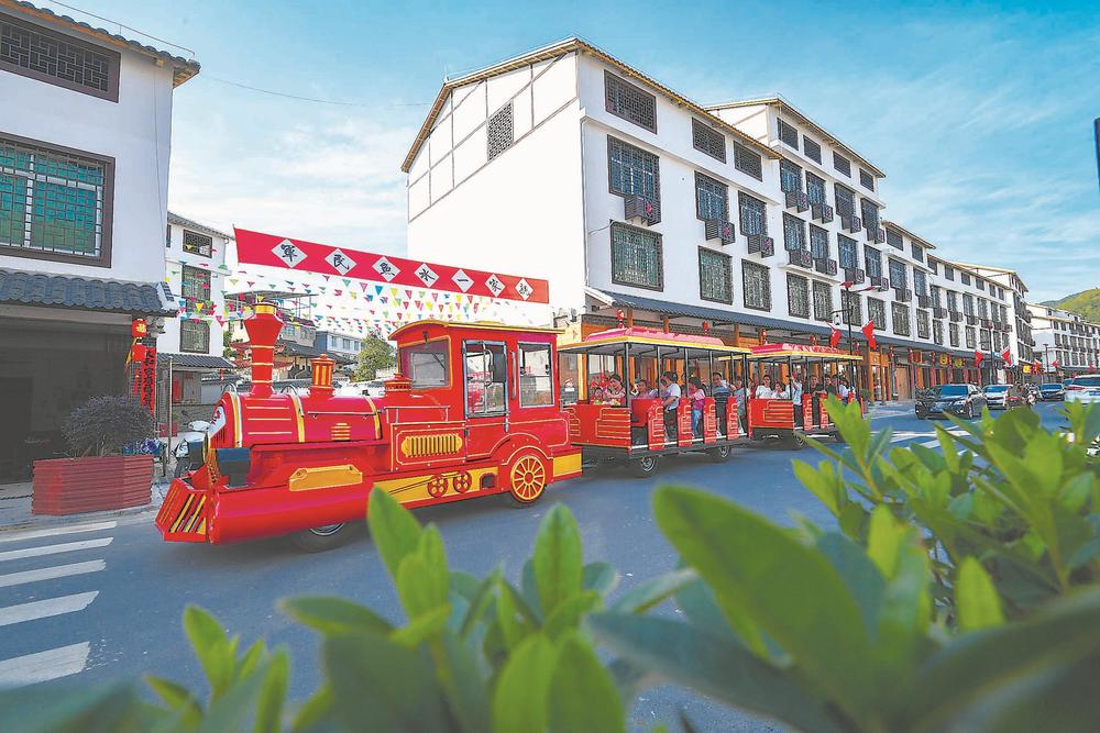 游客乘坐小火车在永定区金砂红色小镇游览。当地将金砂红色小镇打造成为一个集爱国主义教育、红色文化、研学接待、客家风情为一体的景区。