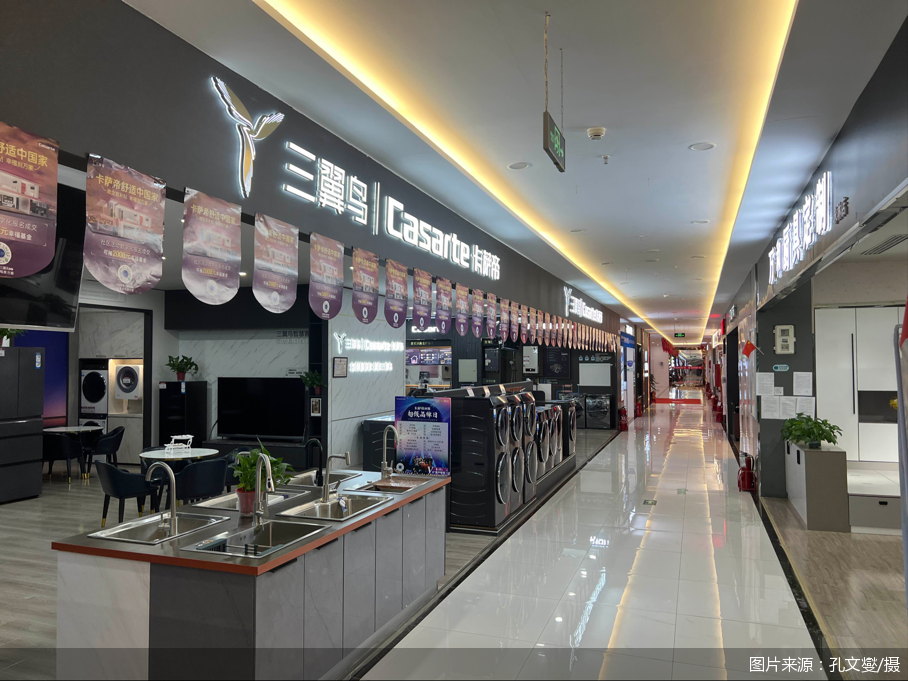 走进一层,200平方米的尚品宅配新店被挡在围挡后面,正在紧锣密鼓地施工中,将于“十一”期间正式亮相;乘坐电梯上二楼,潜水艇卫浴在原先店面的基础上增加了120平方米经营面积,扩充了智能马桶、浴室柜、花洒、电动晾衣机等产品,可选择的品类更加齐全;三楼300平方米的冠珠瓷砖刚开业不久,店门处冠珠瓷砖品牌代言人迪丽热巴的海报十分醒目,配上“每一块都很美”的Slogan,展现出欣欣向荣的气象;距冠珠瓷砖不远处就是海尔旗下家电品牌卡萨帝的体验店,占据着足足300平方米的空间,一排黑色的冰箱在店门口整齐排列,显示出品牌的高端调性。