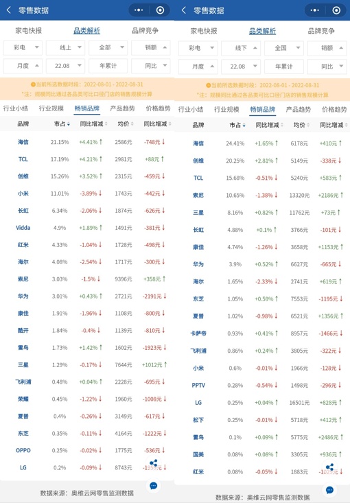 在这样的大背景下,华为智慧屏也有打造子品牌或者新品牌的必要性。从奥维云网数据来看,以销售额计算,1-8月华为智慧屏线上、线下市场份额分别为3.01%、3.9%,和头部品牌的差距还比较大。如果华为智慧屏想快速提升市场份额,推出一个新品牌无疑是一个比较现实的发展路径。